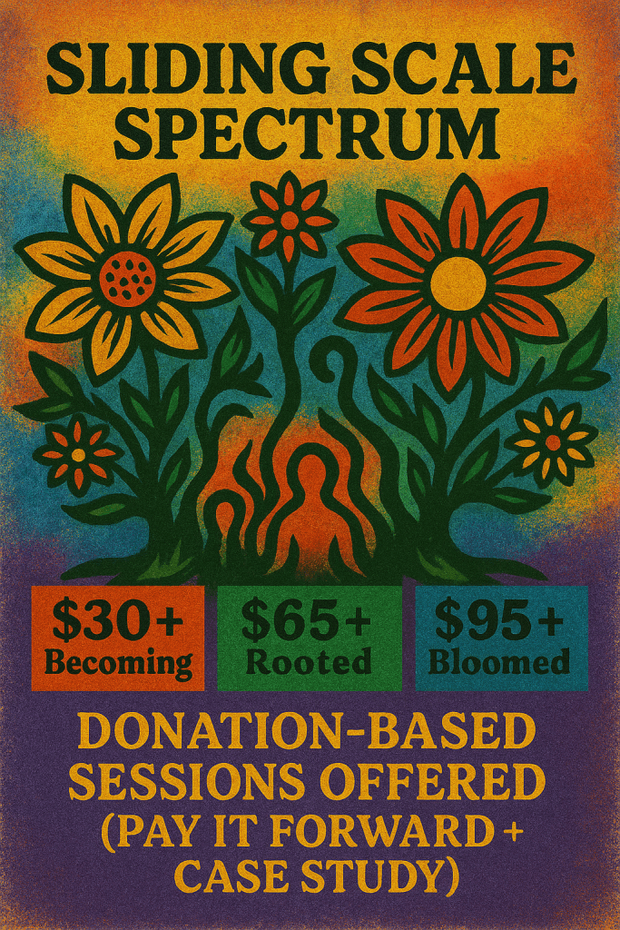 At Just Be.Soulchemy we believe healing should be accessible and community-centered. Our Sliding Scale Spectrum invites you to choose a contribution level that reflects your current capacity and values.